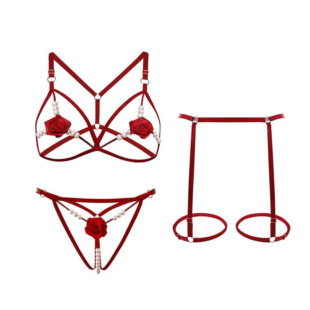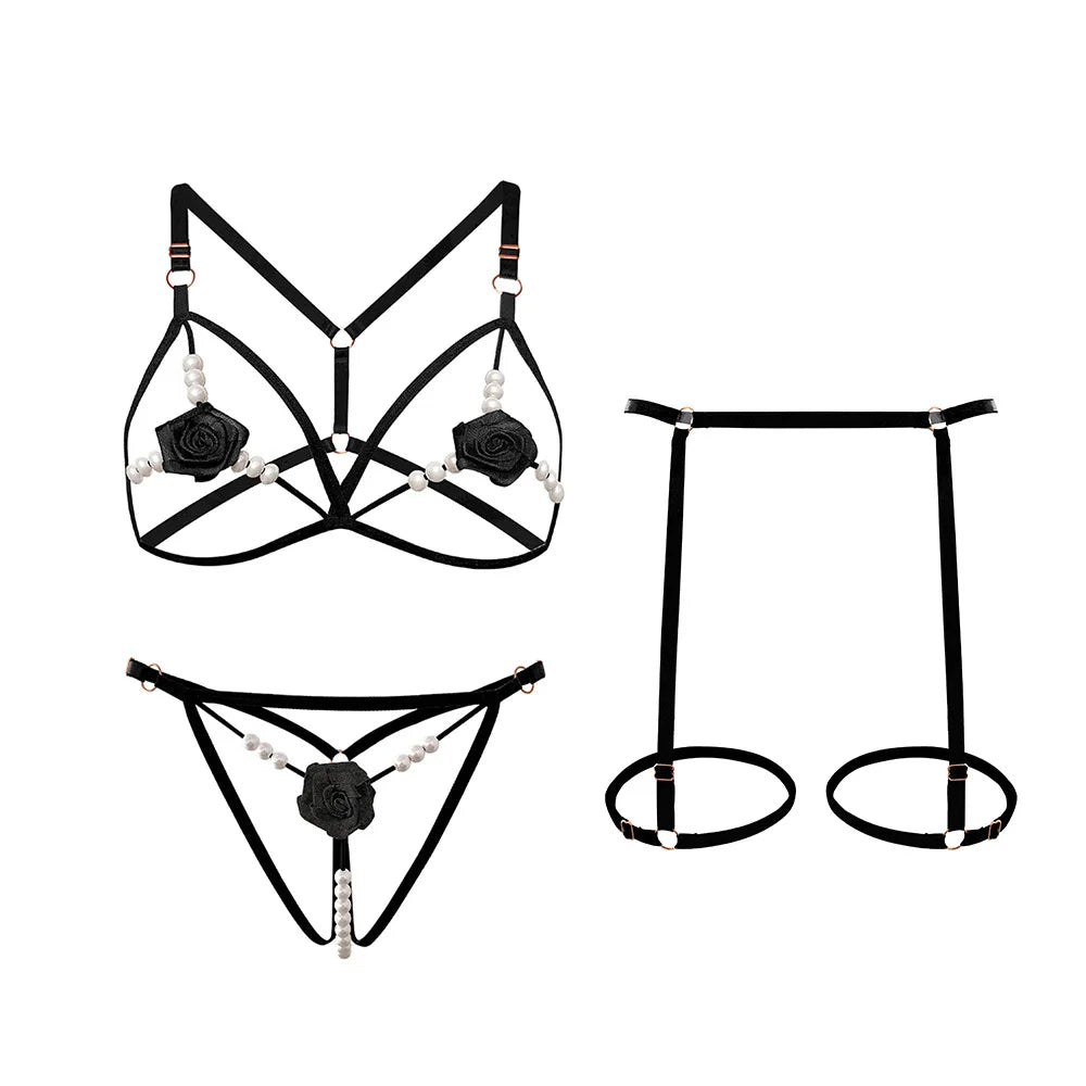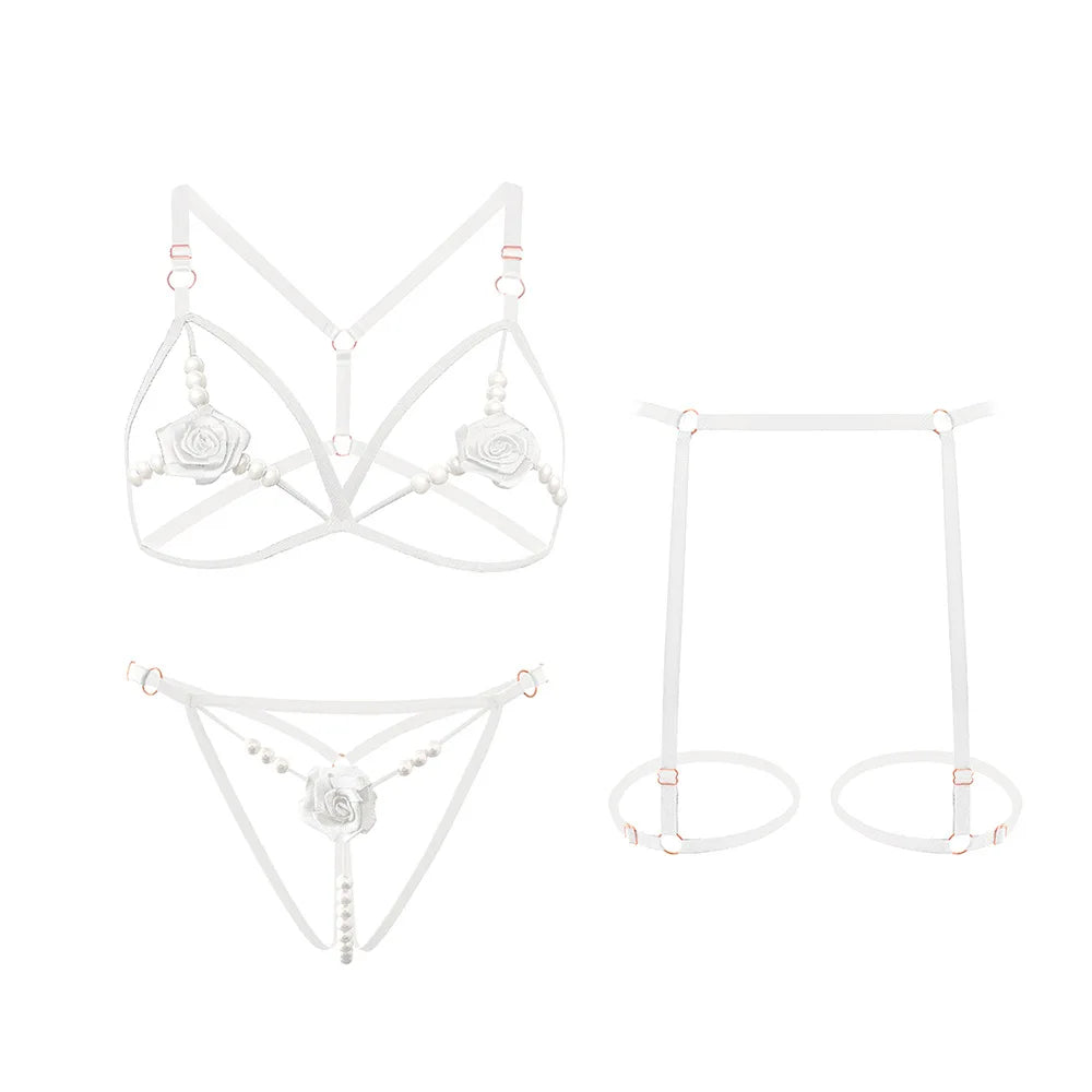 Bloom 3-delad Lingerieset tar förförelse till nya höjder med rosor, pärlor och justerbara detaljer.